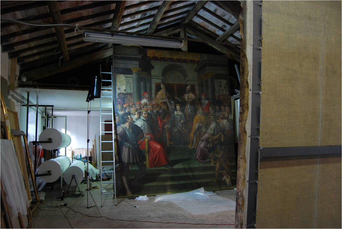 novembre 2008 – aprile 2009Restauro del grande telero eseguito in occasione delle nozze del Granduca Ferdinando I nel 1588 da Cosimo Gamberucci, “Caterina de’ Medici tra i parenti”, olio su tela, 450 x 410 cm.