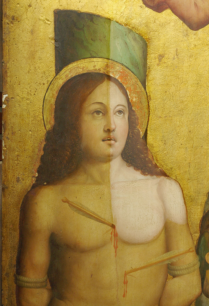 gennaio – giugno 2015Restauro di un dipinto ad olio su tavola, sec. XVI, raffigurante “Madonna con Bambino e Santi Sebastiano e Rocco”, cm 136x217, proveniente dalla Chiesa di Santa Maria di Loreto a Roma.
